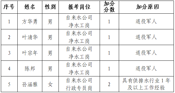 根据《开云app登录入口招聘公告》规定,“对报名参加自来水公司净水工岗位的考生如满足退役军人身份给予综合成绩加1分,荣获个人三等功以上的退役军人给予综合成绩加2分,具有供排水行业1年及以上工作经验者给予综合成绩加2分。对报名参加自来水公司行政专员岗位的考生如具有供排水行业1年及以上工作经验者给予综合成绩加2分”。现对报考人员申请加分的审核工作已全部结束,经审核符合加分条件的人员共5人,现予以公示,接受社会监督。公示时间为2020年11月13日—11月15日。公示期间,如对加分情况有异议,请向黄山市徽投集团反映。公示期满后,如无异议的,按规定程序办理加分手续,逾期不再补办。联系电话:0559-6525368,15665592628。