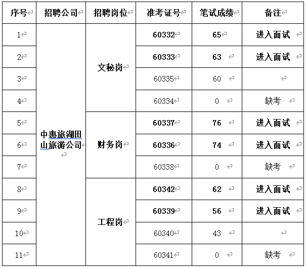根据《黄山中惠旅湖田山旅游开发有限公司招聘员工考试公告》,笔试工作已于2019年12月15日上午结束,现将笔试成绩及进入面试人员名单公布如下: