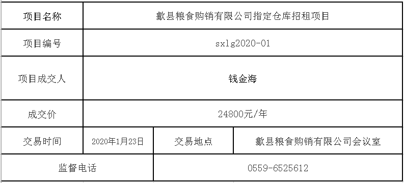 歙县粮食购销有限公司指定仓库招租项目成交公告