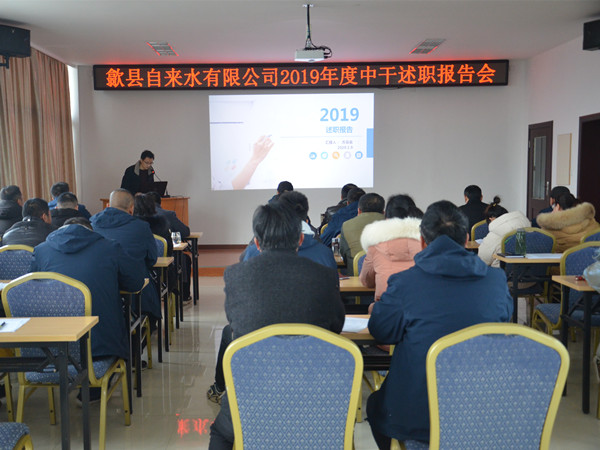 2020年1月9日上午,自来水公司召开了2019年度中干述职报告会。公司领导层、各部门负责人及职工代表参加了此次会议。