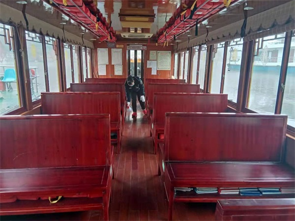 此次疫情形势严峻,为确保防疫工作有效落实,景区虽已闭园,客运班船虽已停运,公司各部门丝毫不敢懈怠,购买了充足的口罩免费派发给员工;制定了手部清洗、口罩佩戴操作指南,对留守景区的值班人员进行定时体温检测;建立工作群,通过图文方式,对值班工作人员的个人防护知识进行重点培训,保证每人必带口罩、定时消毒、定时检测个人体温,预防值班工作人员感染,保障每位值班工作人员的健康安全。